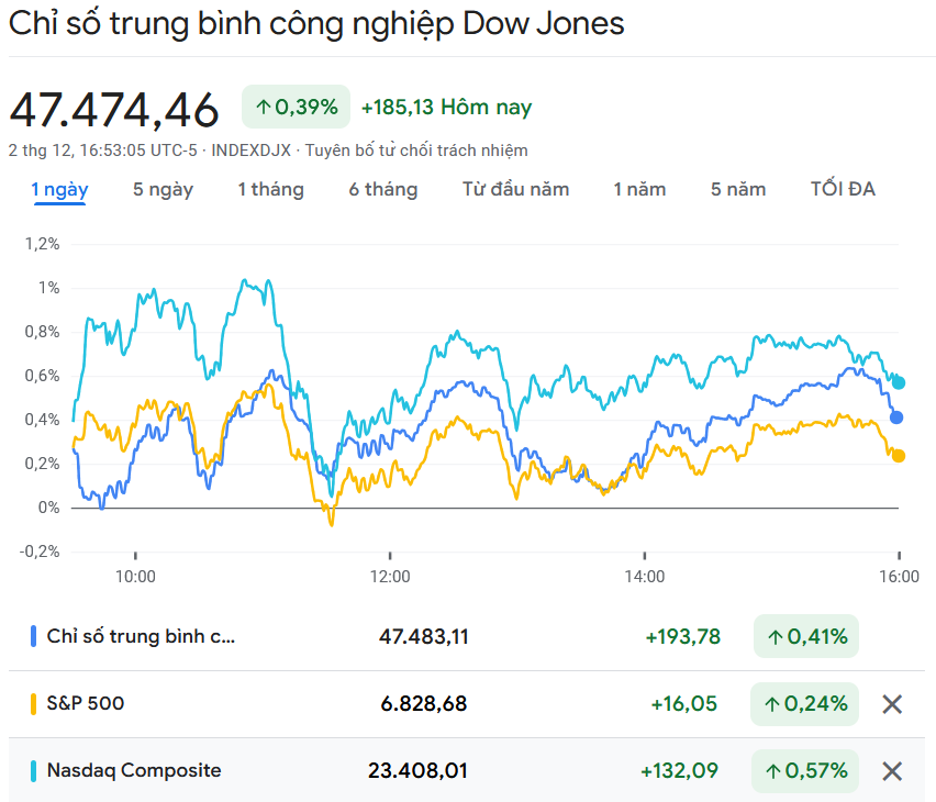 Đóng cửa phiên giao dịch thứ Ba ngày 2/12, chỉ số Dow Jones tăng 185,13 điểm (tương đương 0,39%) lên 47.474,4 điểm.