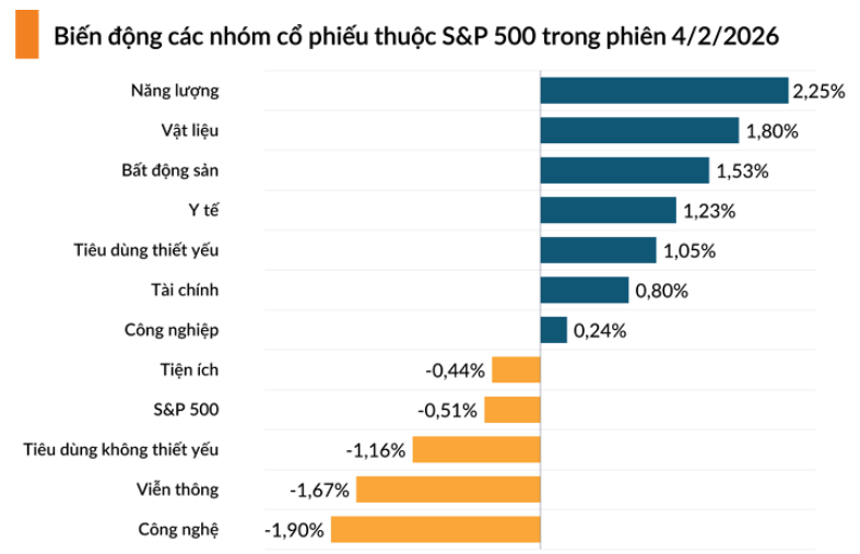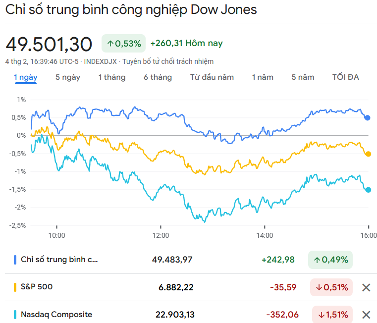 Ngược lại, chỉ số Dow Jones tăng 260,31 điểm, tương đương 0,53%, lên 49.501,30 điểm.