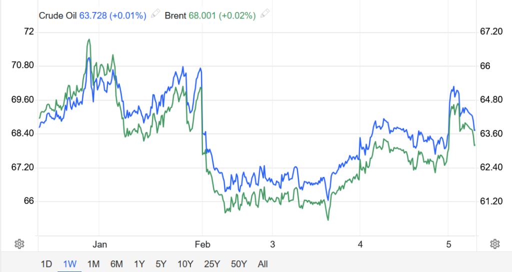 Khép phiên ngày 04/02, hợp đồng dầu WTI tương lai tăng 1,93 USD, tương đương 3,05%, lên 65,14 USD/thùng khi đóng cửa.