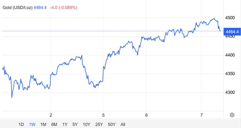 Hợp đồng vàng tương lai của Mỹ giao tháng 2 chốt phiên tăng 1%, lên $4496,10/oz.