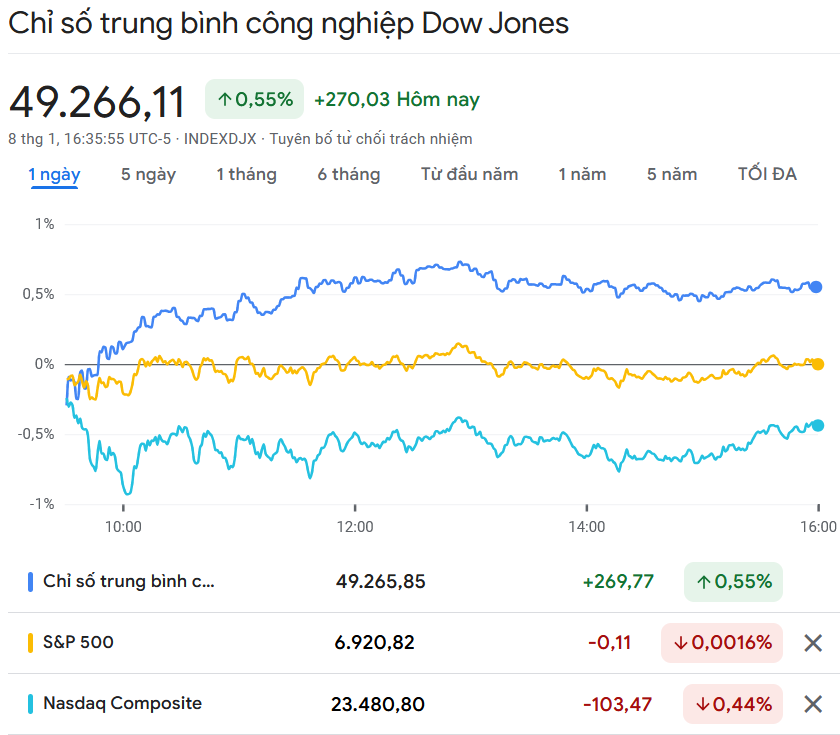 Đóng cửa phiên giao dịch thứ Năm ngày 7/1, chỉ số Dow Jones tăng 270,03 điểm (tương đương 0,55%), chốt phiên tại 49.266,11 điểm.