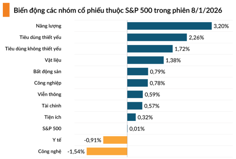 Bảng điện tử S&P 500 ghi nhận sự bứt tốc ngoạn mục của cổ phiếu năng lượng theo giá dầu thô. Chỉ có 2/11 nhóm ngành là Công nghệ và Y tế giảm trong phiên thứ Năm.