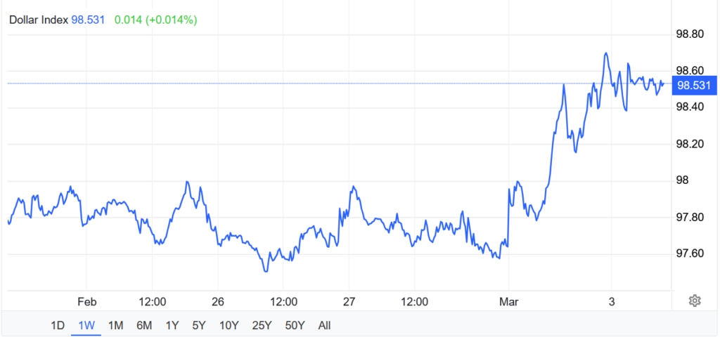 Chỉ số USD tăng lên trên 98,5 vào thứ Hai, chạm mức cao nhất trong năm tuần khi các nhà đầu tư tìm đến những tài sản trú ẩn an toàn trong bối cảnh chiến tranh leo thang ở Trung Đông.