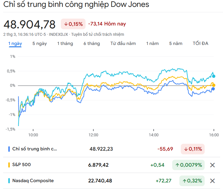 Chỉ số Dow Jones Industrial Average giảm 73,14 điểm, tương đương 0,15%, xuống 48.904,78 điểm, sau khi từng có lúc mất gần 600 điểm.