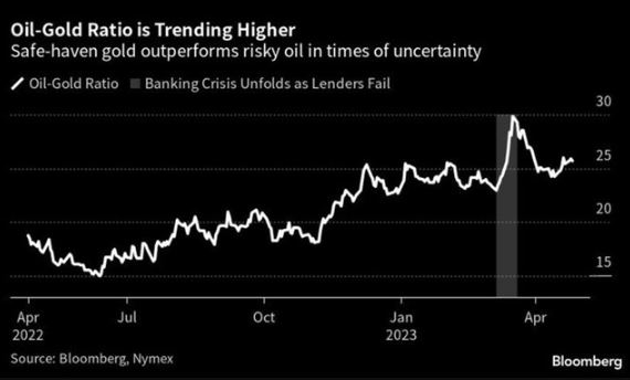 Tỷ lệ dầu – vàng (giá giao ngay của vàng thỏi chia cho hợp đồng tương lai dầu WTI) là một phong vũ biểu cho tình trạng của nền kinh tế toàn cầu, trong đó chỉ số cao hơn cho thấy các nhà đầu tư đang chuẩn bị cho một cuộc suy thoái. Tỷ lệ này đã tăng lên kể từ giữa năm 2022 và tăng đột biến vào cuối tháng 3/2023 khi cuộc khủng hoảng ngân hàng thúc đẩy sức hấp dẫn của vàng như một nơi trú ẩn an toàn.