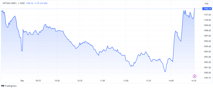 Chốt phiên, VN-Index tăng 8,03 điểm (+0,73%) lên 1.102,16 mã giảm; HNX-Index tăng 0,11 điểm (+0,05%) lên 226,26 điểm; UPCoM-Index tăng 0,2 điểm (+0,23%) lên 85,19 điểm.