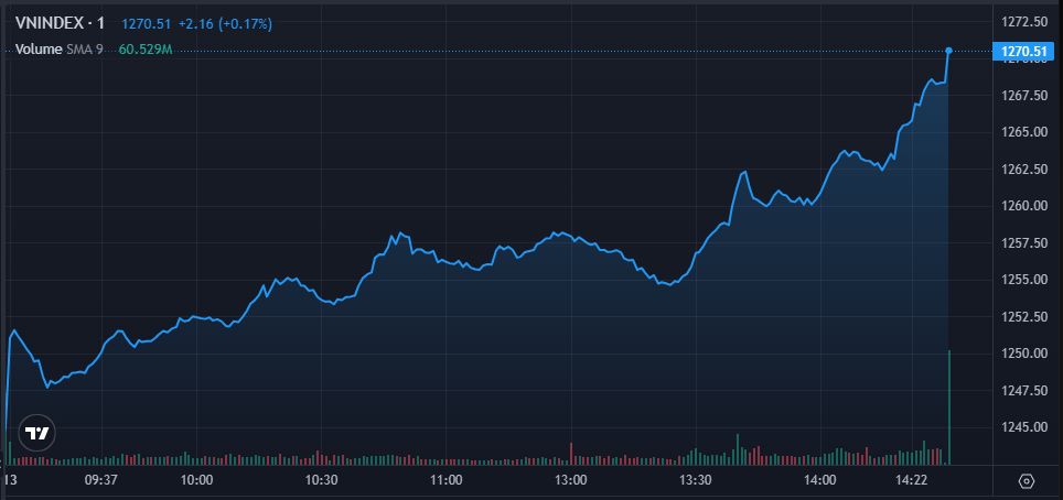 Kết phiên, VN-Index tăng 25,51 điểm (2,05%), lên mức 1.270,51 điểm; HNX-Index tăng 4,17 điểm (,78%), lên mức 238,2 điểm; UPCoM-Index tăng 0,76 điểm (+0,84%), lên 91,53 điểm.