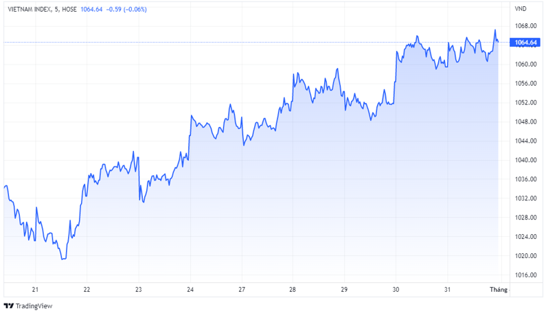 VN-Index kết phiên cuối quý tăng 5,2 điểm, lên mức 1.064,64 điểm và tăng 5,7% so với đầu năm. Đây đã là chuỗi tăng 9 phiên liên tiếp với tổng mức 41,54 điểm (4,06%), đáng chú ý là biên độ dao động khá hẹp với mức tăng chỉ khoảng 2-9 điểm mỗi phiên.
