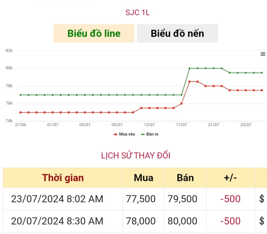 Cụ thể, giá mua – bán vàng miếng tại SJC Hồ Chí Minh hiện ở mức 77,50 – 79,50 triệu đồng/lượng, giảm 500.000 đồng/lượng cả hai chiều mua – bán so với mở cửa phiên đầu tuần.