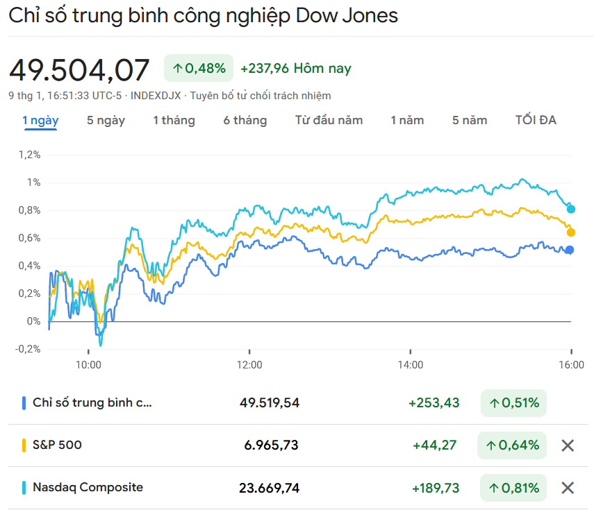 Chỉ số Dow Jones Industrial Average tăng 237,96 điểm, tương đương 0,48%, lên 49.504,07 điểm – cũng là mức đóng cửa cao kỷ lục.