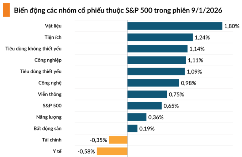 Bảng điện tử S&P 500 chứng kiến 9/11 nhóm ngành tăng, dẫn đầu là vật liệu.