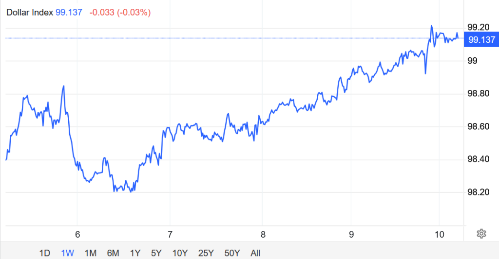 Hôm thứ Sáu, Chỉ số DXY đánh mất phần tăng, lùi về gần mốc 99, nhưng vẫn duy trì quanh mức cao nhất trong gần một tháng khi nhà đầu tư đánh giá các dữ liệu mới về thị trường lao động. Báo cáo việc làm mới nhất của Mỹ củng cố kỳ vọng rằng Cục Dự trữ Liên bang (Fed) sẽ thận trọng trong việc cắt giảm lãi suất.