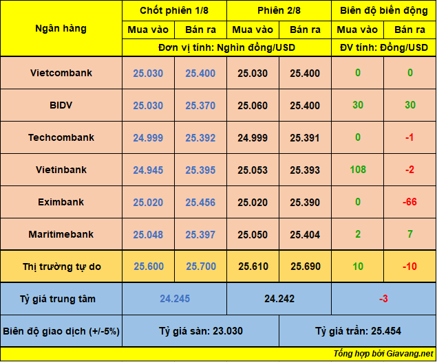Ngân hàng Eximbank, niêm yết giao dịch mua – bán ở mốc 25.020 – 25.390 VND/USD, mua vào đi ngang, bán ra giảm 66 đồng so với chốt phiên 1/8.