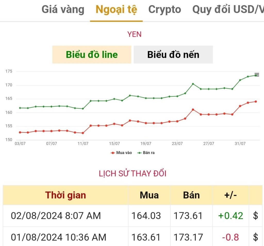 Vietinbank, niêm yết giao dịch mua – bán ở mức 165,01 – 172,76 VND/JPY, tăng 0,81 đồng chiều mua, giảm 1,14 đồng chiều bán so với phiên 1/8.