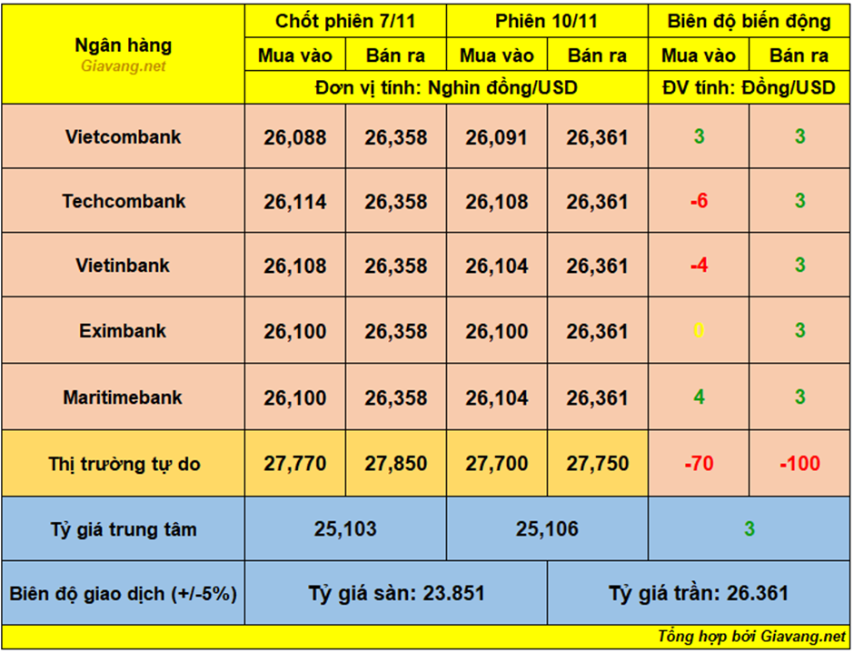 Vietinbank, niêm yết giao dịch mua – bán ở mốc 26.104 – 26.361 VND/USD, giá mua giảm 4 đồng và giá bán tăng 3 đồng so với hôm 7/11.