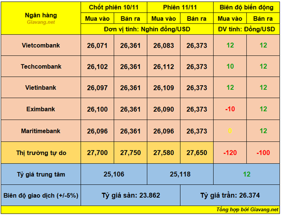 Vietinbank, niêm yết giao dịch mua – bán ở mốc 26.109 – 26.373 VND/USD, giá mua tăng 12 đồng và giá bán tăng 12 đồng so với hôm 10/11.