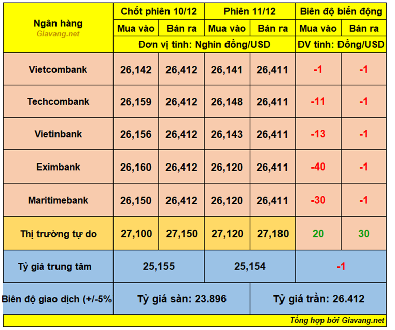 Vietinbank, niêm yết giao dịch mua – bán ở mốc 26.143 – 26.411 VND/USD, giá mua hạ 13 đồng và giá bán lùi 1 đồng so với hôm 10/12.