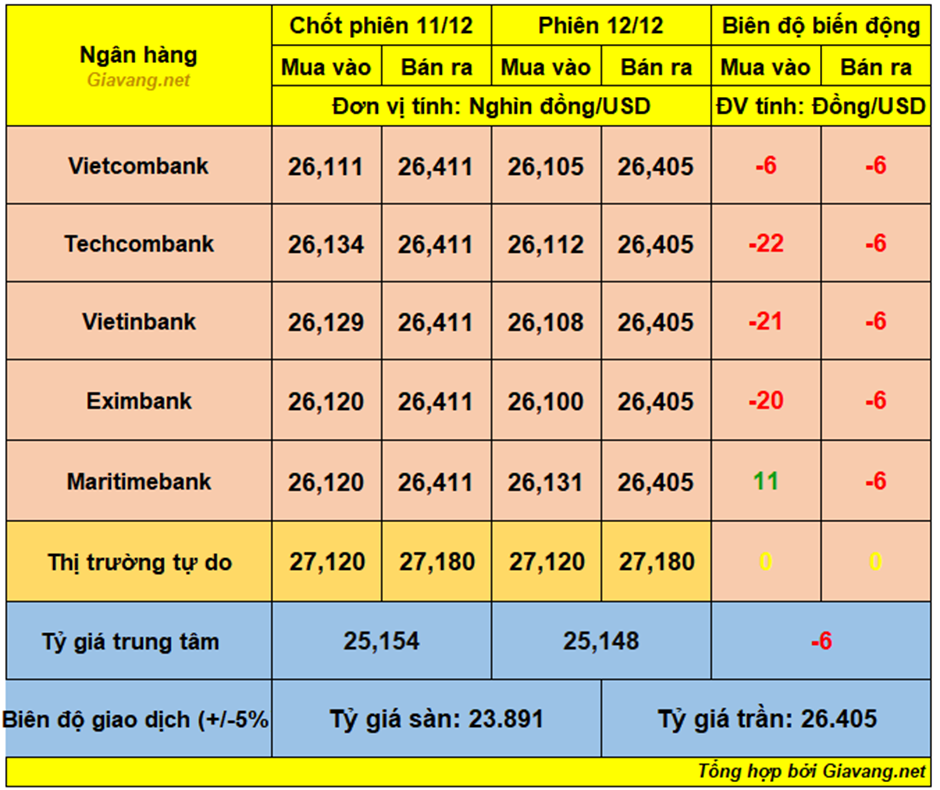 Vietinbank, niêm yết giao dịch mua – bán ở mốc 26.108 – 26.405 VND/USD, giá mua hạ 21 đồng và giá bán lùi 6 đồng so với hôm 11/12.