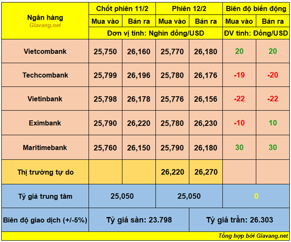 Vietcombank, niêm yết giao dịch mua – bán ở mốc 25.770 – 26.180 VND/USD, giá mua tăng 20 đồng và giá bán tăng 20 đồng so với cuối ngày 11/2.