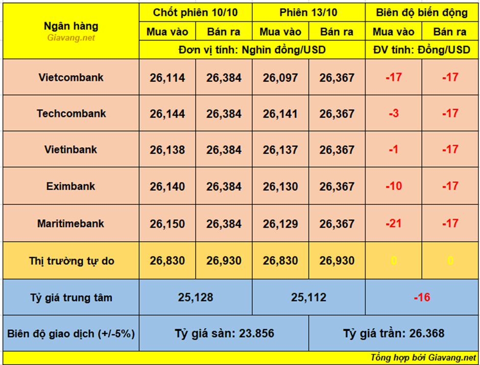 Techcombank niêm yết giao dịch mua – bán ở mốc 26.141 – 26.367 VND/USD, chiều mua hạ 3 đòng và hạ 17 đồng chiều bán so với cuối ngày 10/10.