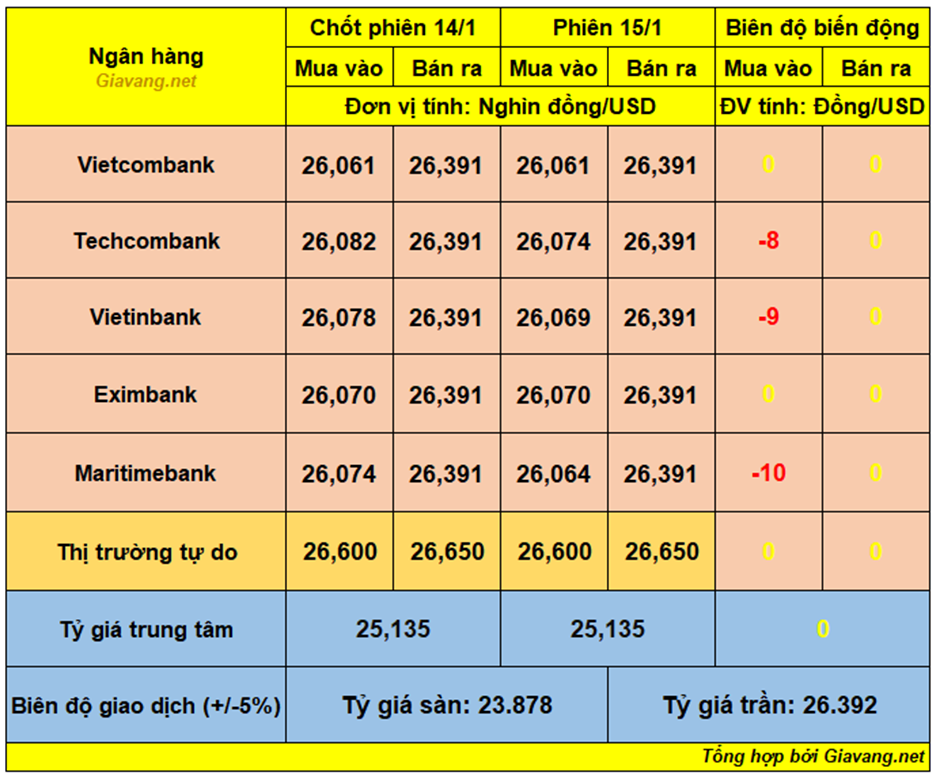 Vietinbank, niêm yết giao dịch mua – bán ở mốc 26.069 – 26.391 VND/USD, giá mua giảm 9 đồng và giá bán đi ngang so với hôm 14/1.