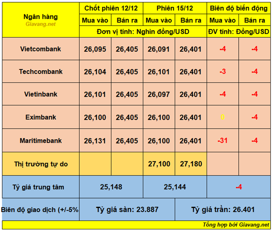 Vietinbank, niêm yết giao dịch mua – bán ở mốc 26.097 – 26.401 VND/USD, giá mua hạ 4 đồng và giá bán lùi 4 đồng so với hôm 12/12.