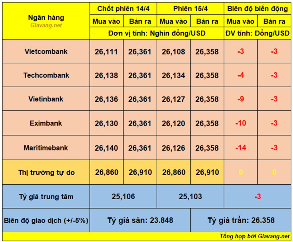 Vietcombank, niêm yết giao dịch mua – bán ở mốc 26.108 – 26.358 VND/USD, giá mua giảm 3 đồng và giá bán hạ 3 đồng so với cuối ngày 14/4.