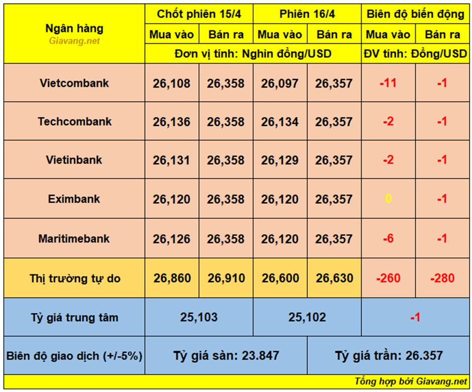 Maritimebank, niêm yết giao dịch mua – bán ở mốc 26.120 – 26.357 VND/USD, giá mua giảm 6 đồng và giá bán hạ 1 đồng so với cuối ngày 15/4.