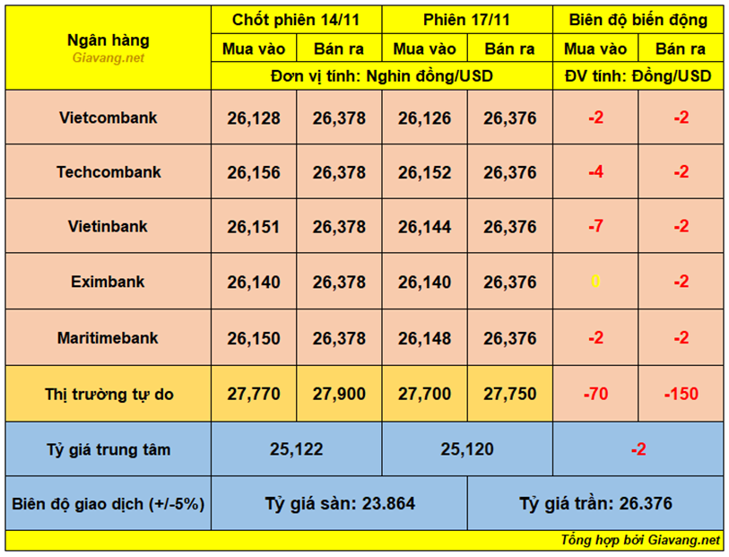 Vietinbank, niêm yết giao dịch mua – bán ở mốc 26.144 – 26.376 VND/USD, giá mua giảm 7 đồng và giá bán giảm 2 đồng so với hôm 14/11.