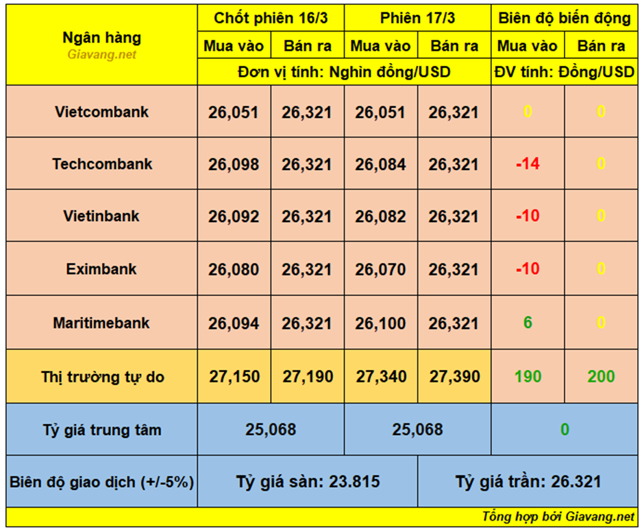 Maritimebank, niêm yết giao dịch mua – bán ở mốc 26.090 – 26.321 VND/USD, giá mua tăng 20 đồng và giá bán tăng 3 đồng so với cuối ngày 16/3.
