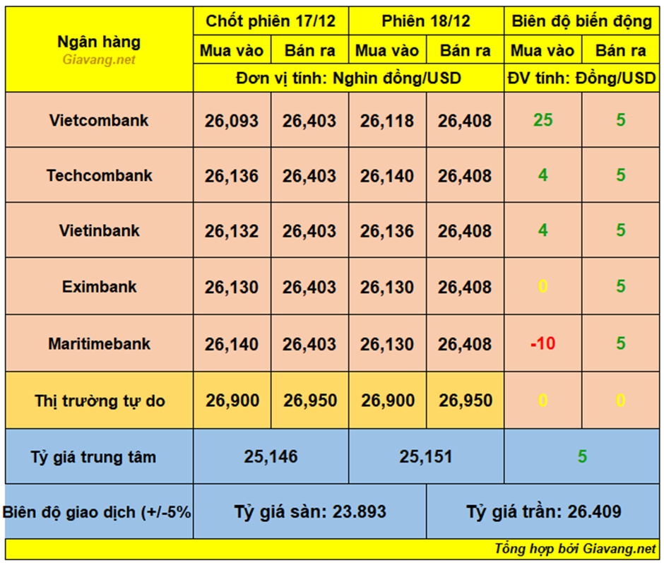 Vietinbank, niêm yết giao dịch mua – bán ở mốc 26.136 – 26.408 VND/USD, giá mua tăng 4 đồng và giá bán tăng 5 đồng so với hôm 17/12.