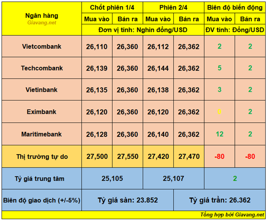 Vietcombank, niêm yết giao dịch mua – bán ở mốc 26.112 – 26.362 VND/USD, giá mua tăng 2 đồng và giá bán tăng 2 đồng so với cuối ngày 1/4.