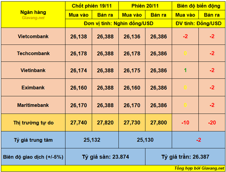 Eximbank, niêm yết giao dịch mua – bán ở mốc 26.160 – 26.386 VND/USD, giá mua không đổi và giá bán hạ 2 đồng so với cuối ngày 19/11.