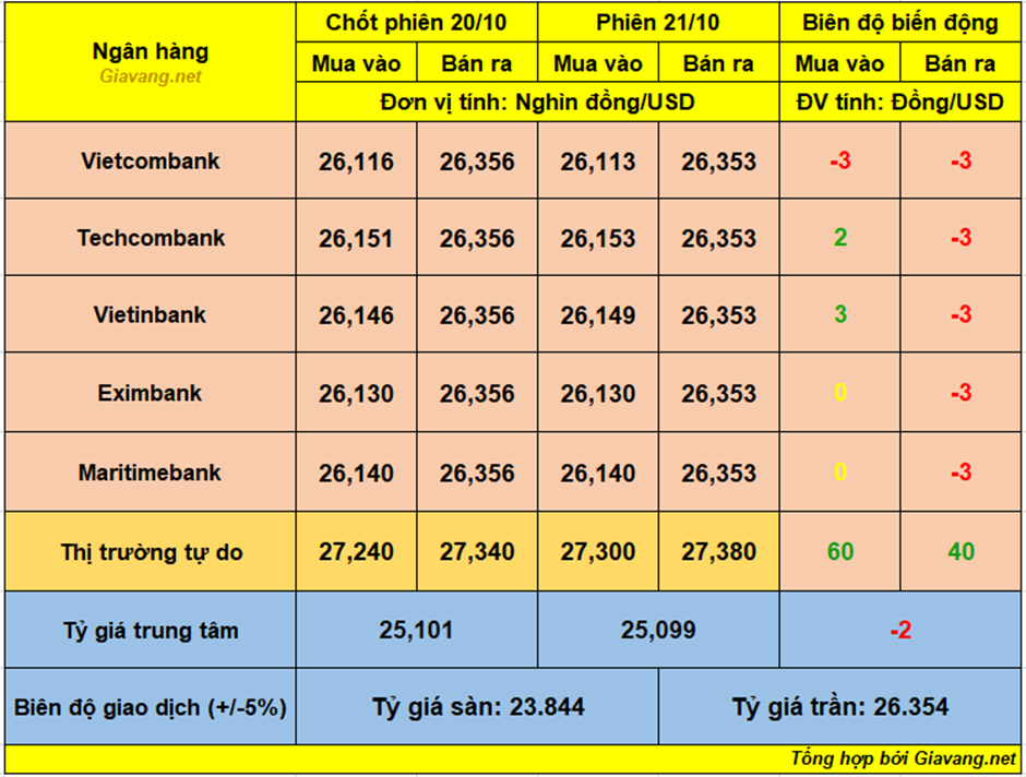 Vietinbank, niêm yết giao dịch mua – bán ở mốc 26.149 – 26.353 VND/USD, giá mua tăng 3 đồng và giá bán hạ 3 đồng so với hôm 20/10.