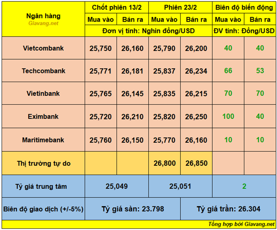 Vietcombank, niêm yết giao dịch mua – bán ở mốc 25.790 – 26.200 VND/USD, giá mua tăng 40 đồng và giá bán tăng 40 đồng so với cuối ngày 13/2.