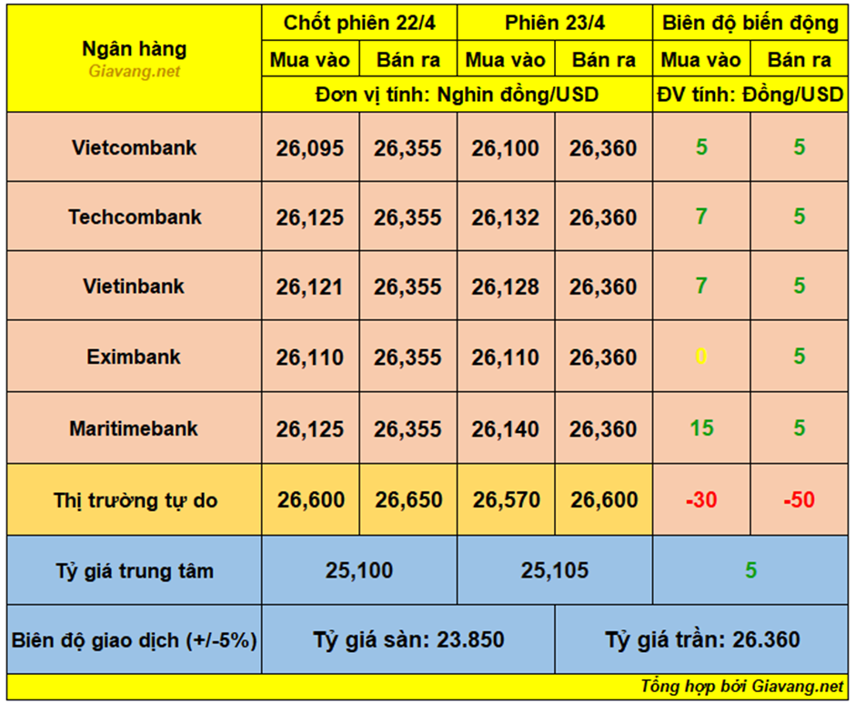 Vietcombank, niêm yết giao dịch mua – bán ở mốc 26.100 – 26.360 VND/USD, giá mua tăng 5 đồng và giá bán tăng 5 đồng so với cuối ngày 22/4.