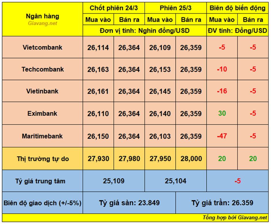 Maritimebank, niêm yết giao dịch mua – bán ở mốc 26.103 – 26.359 VND/USD, giá mua giảm 47 đồng và giá bán lùi 5 đồng so với cuối ngày 24/3.