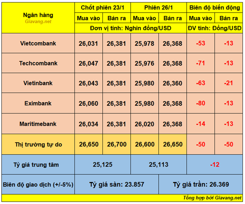 Vietcombank, niêm yết giao dịch mua – bán ở mốc 25.978 – 26.368 VND/USD, giá mua giảm 53 đồng và giá bán hạ 13 đồng so với cuối ngày 23/1.