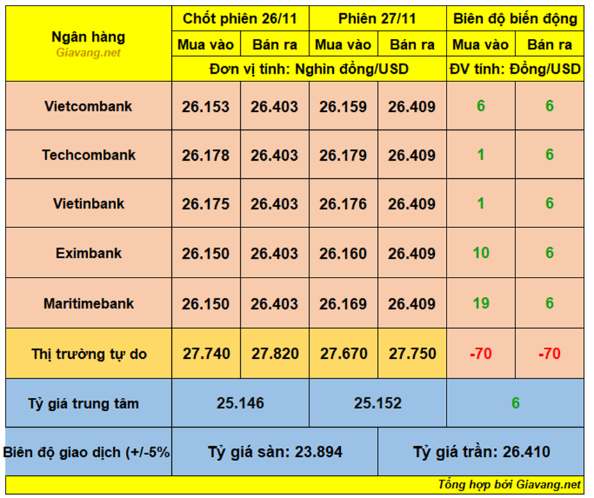 Vietinbank, niêm yết giao dịch mua – bán ở mốc 26.176 – 26.409 VND/USD, giá mua tăng 1 đồng và giá bán tăng 6 đồng so với hôm 26/11.