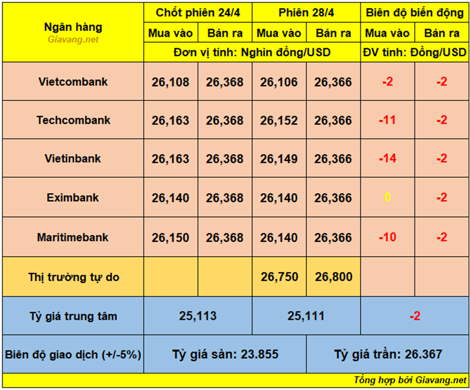 Vietinbank, niêm yết giao dịch mua – bán ở mốc 26.149 – 26.366 VND/USD, giá mua lùi 13 đồng và giá bán hạ 2 đồng so với hôm 24/4.