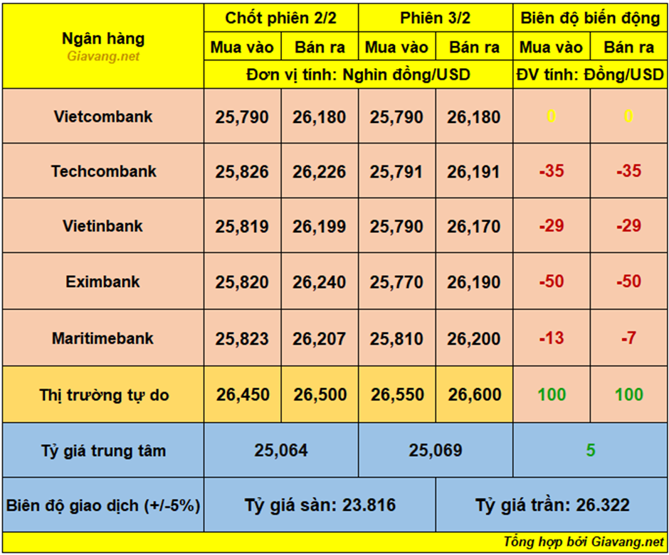 Eximbank, niêm yết giao dịch mua – bán ở mốc 25.770 – 26.190 VND/USD, giá mua giảm 50 đồng và giá bán hạ 50 đồng so với cuối ngày 2/2.