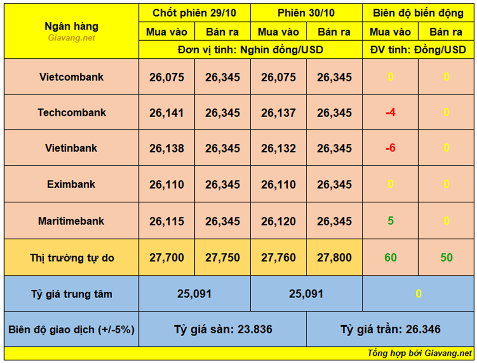 Hôm nay (30/10) Ngân hàng Nhà nước công bố tỷ giá trung tâm cặp đồng tiền VND/USD được áp dụng trong ngày ở mức 25.091 VND/USD, giữ nguyên so với niêm yết hôm 29/10.