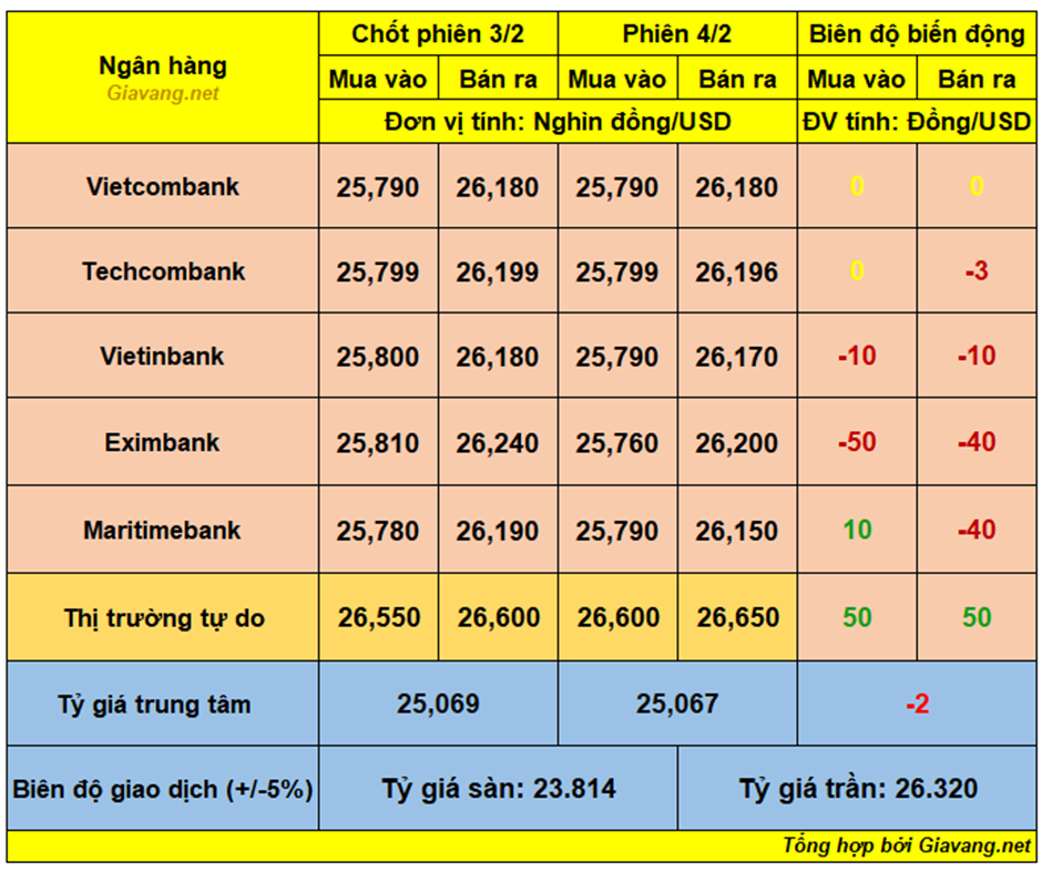 Maritimebank, niêm yết giao dịch mua – bán ở mốc 25.790 – 26.150 VND/USD, giá mua tăng 10 đồng và giá bán giảm 40 đồng so với cuối ngày 3/2.