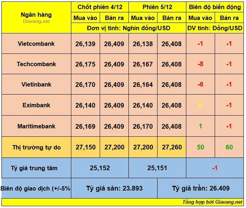 Vietinbank, niêm yết giao dịch mua – bán ở mốc 26.164 – 26.408 VND/USD, giá mua giảm 6 đồng và giá bán giảm 1 đồng so với hôm 4/12.
