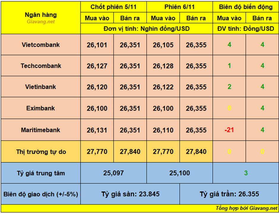 Eximbank, niêm yết giao dịch mua – bán ở mốc 26.100 – 26.355 VND/USD, giá mua đi ngang và giá bán tăng 4 đồng so với cuối ngày 5/11.