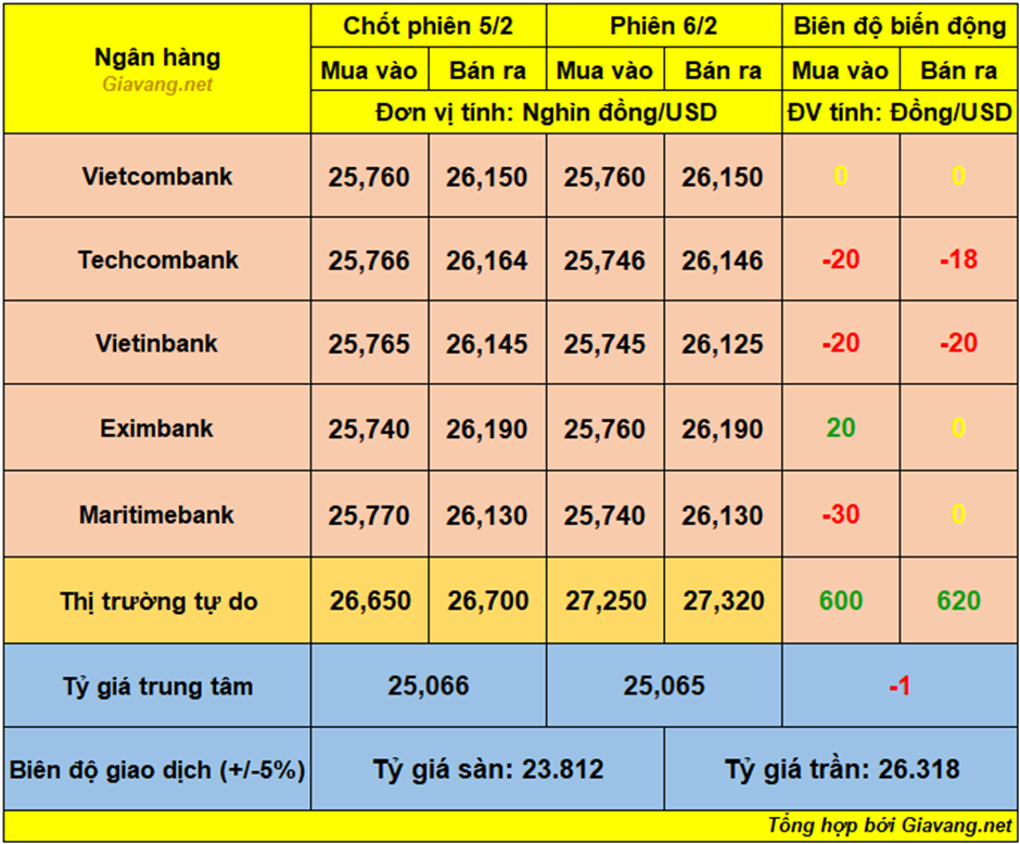 Vietcombank, niêm yết giao dịch mua – bán ở mốc 25.760 – 26.150 VND/USD, giá mua không đổi và giá bán đi ngang so với cuối ngày 5/2.