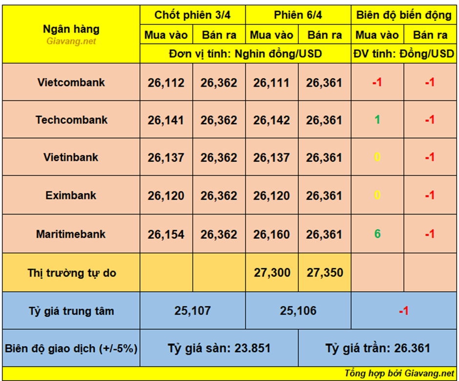 Techcombank niêm yết giao dịch mua – bán ở mốc 26.142 – 26.361 VND/USD, chiều mua tăng 1 đồng và chiều bán giảm 1 đồng so với cuối ngày 3/4.