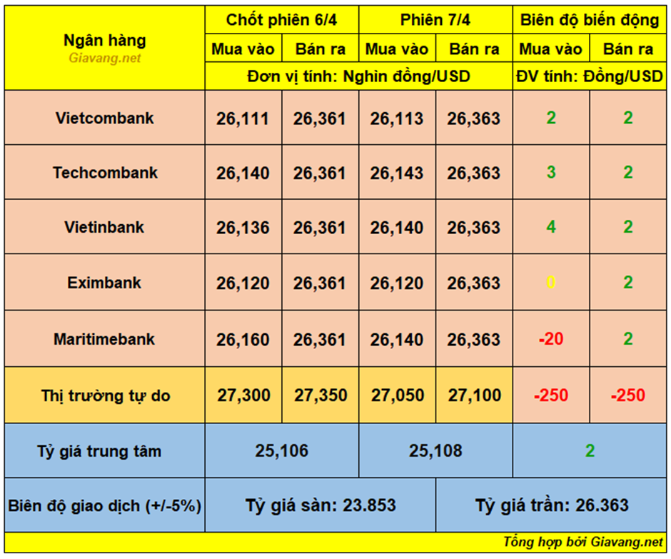 Vietcombank, niêm yết giao dịch mua – bán ở mốc 26.113 – 26.363 VND/USD, giá mua tăng 2 đồng và giá bán tăng 2 đồng so với cuối ngày 6/4.