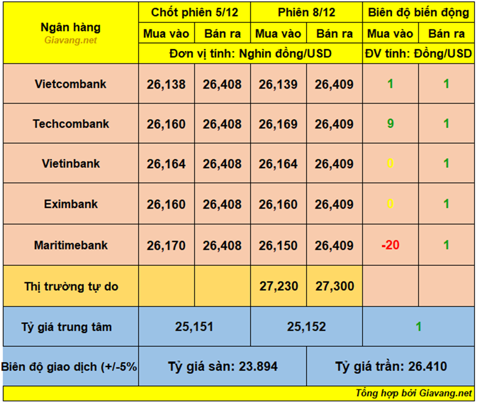 Vietinbank, niêm yết giao dịch mua – bán ở mốc 26.164 – 26.409 VND/USD, giá mua không đổi và giá bán tăng 1 đồng so với hôm 5/12.