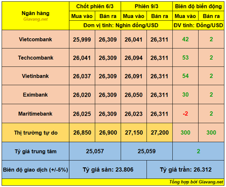 Maritimebank, niêm yết giao dịch mua – bán ở mốc 26.023– 26.309 VND/USD, giá mua giảm 2 đồng và giá bán tăng 2 so với cuối ngày 6/3.